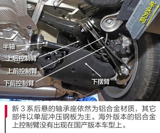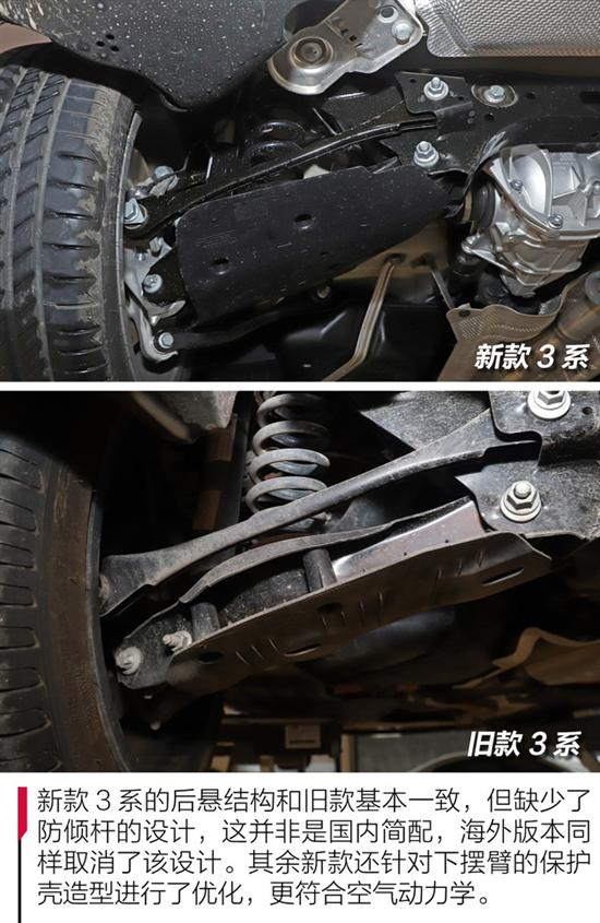新3系与旧款相比,其依然采用前双球节减振弹簧支柱+后多连杆的设计,总体结构基本一致,只在一些用料的地方有区别。